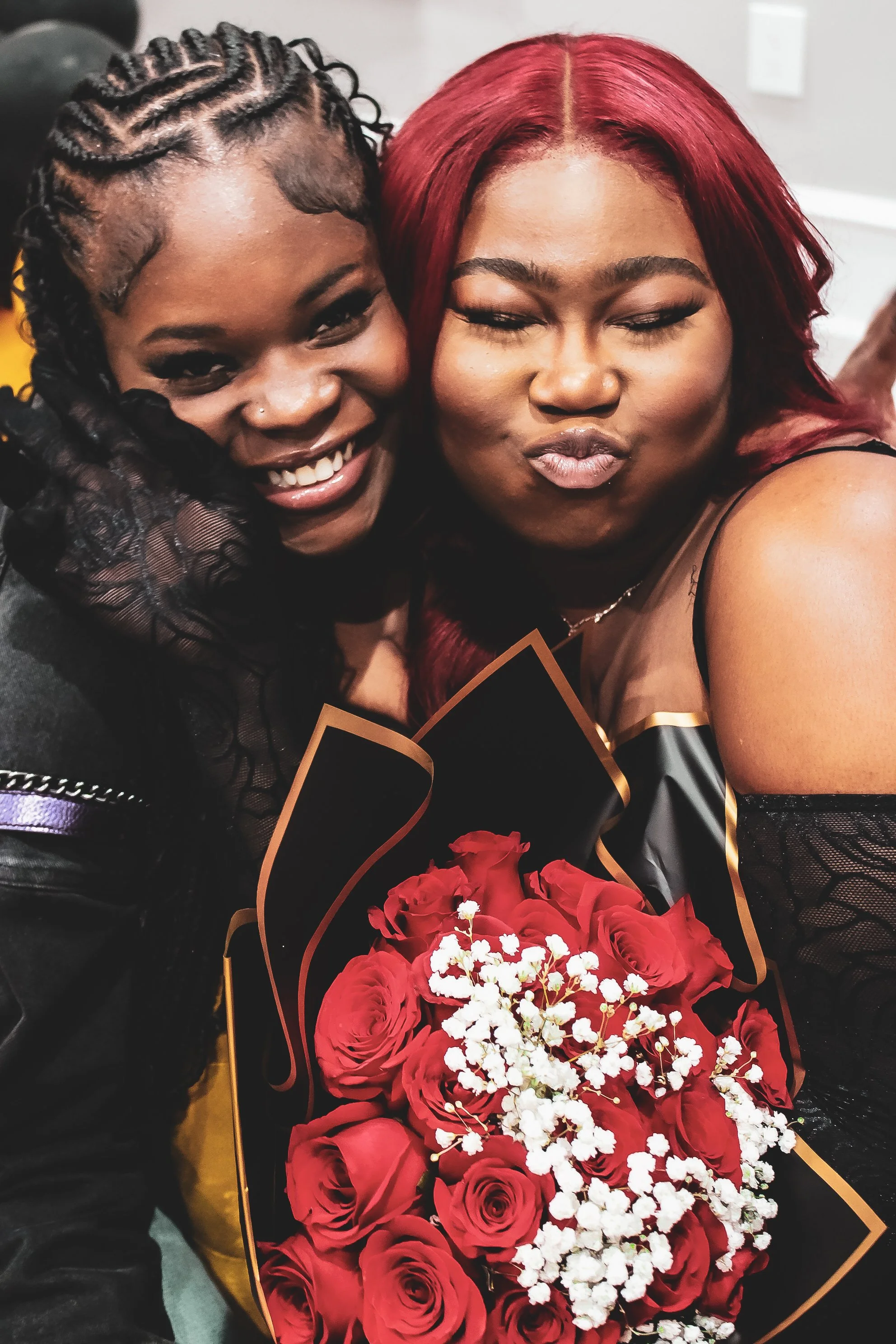 Black lace, red roses, and a soft glow of confidence.